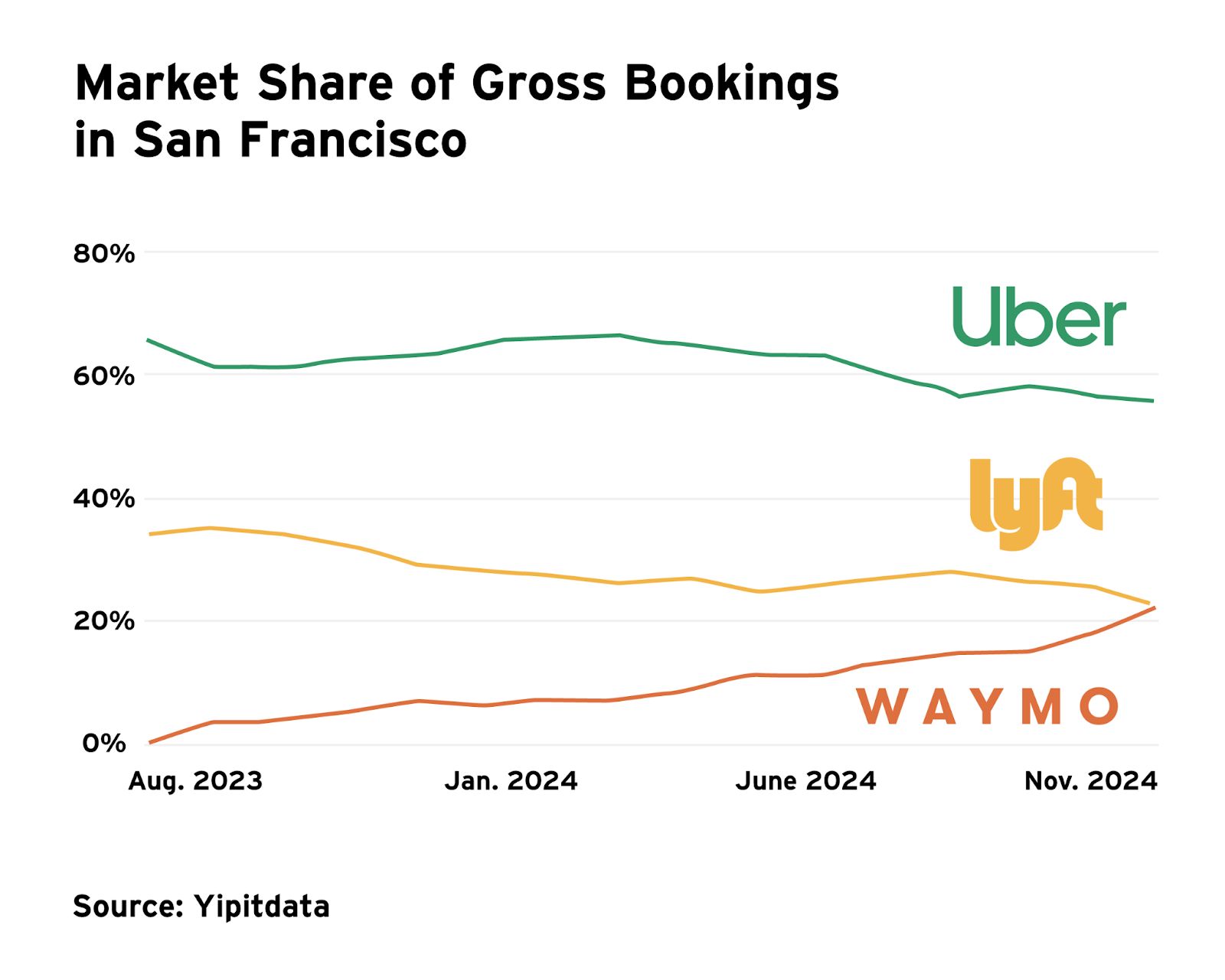 The company now controls 76% of the U.S. rideshare market, widening its lead over Lyft (24%). In San Francisco, Lyft faces an additional threat: Waymo, whose robotaxis are rapidly eating into its market share.