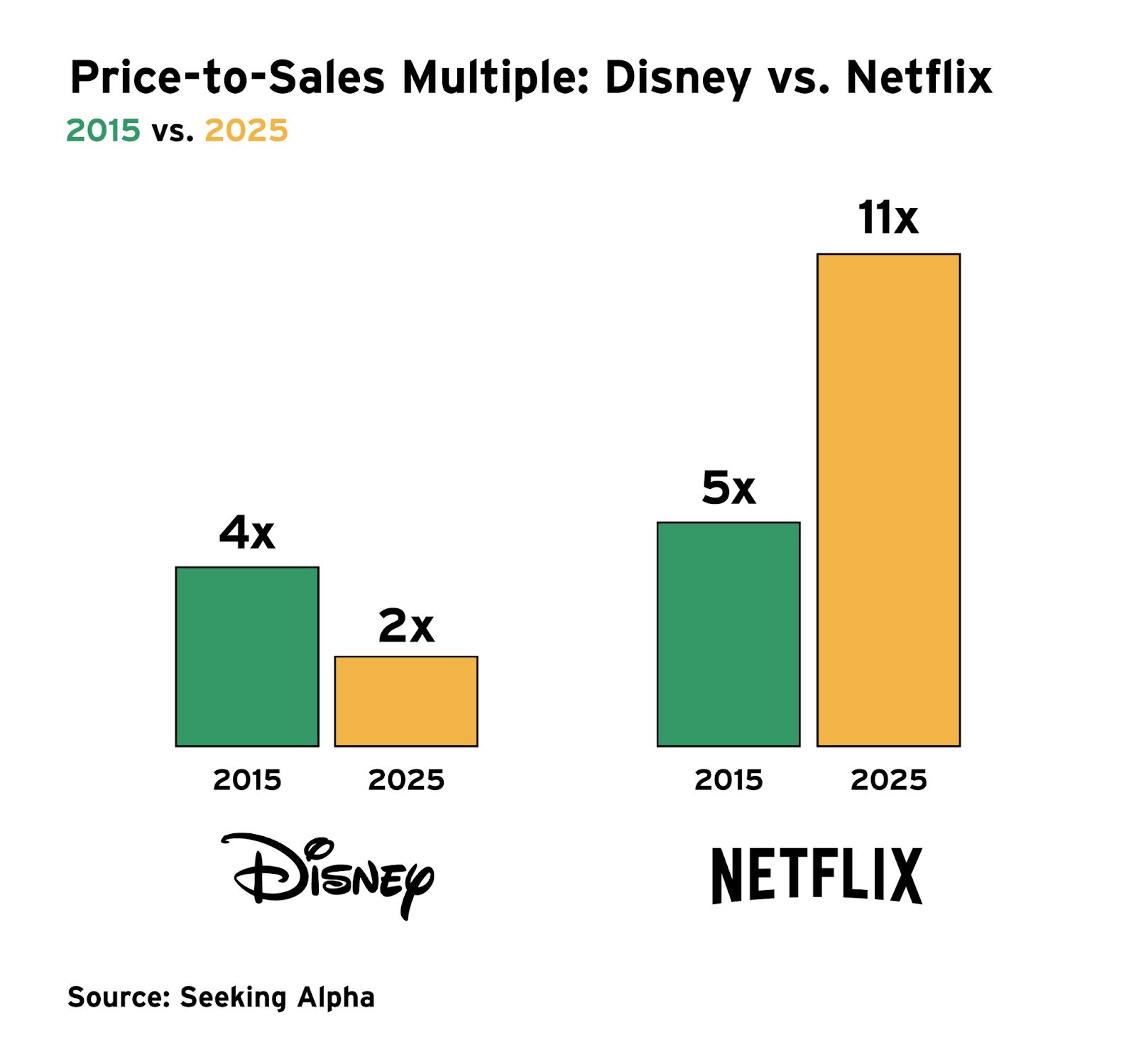 Netflix funneled more than half of its $15 billion content budget last year into international production, while Disney allocated just 4% overseas. The result is a stark contrast in profitability: Netflix runs at a 27% operating margin, while Disney+’s is less than 5%. The market has responded, pushing Netflix’s stock up 1,500% over the past decade, while Disney has gained just 18%.
