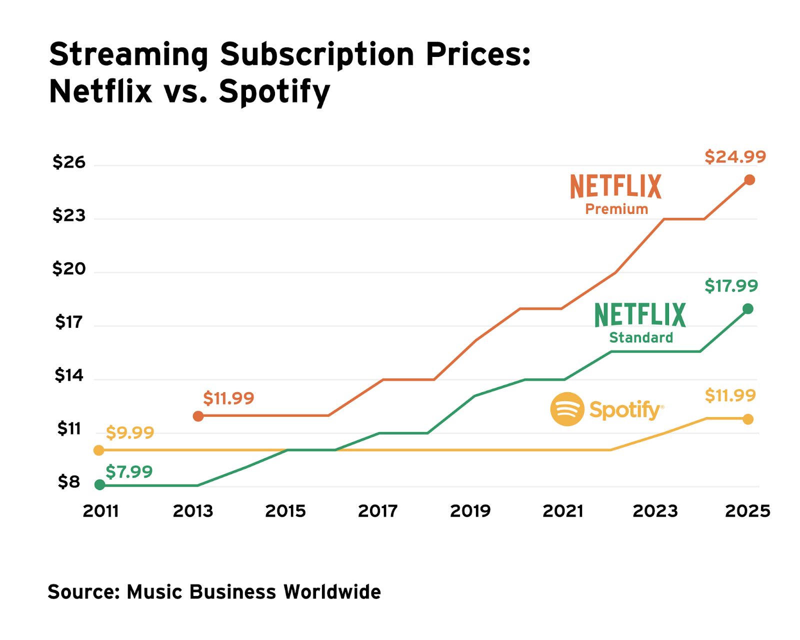 Artists’ outrage feels misplaced. Spotify wasn’t hoarding cash; it was losing money for 16 years. Netflix has been profitable since 2003 because it’s been able to raise prices 13 times without losing its grip on subscribers. Netflix’s original content acts as a moat, while Spotify’s library is nearly identical to Apple’s and Amazon’s.