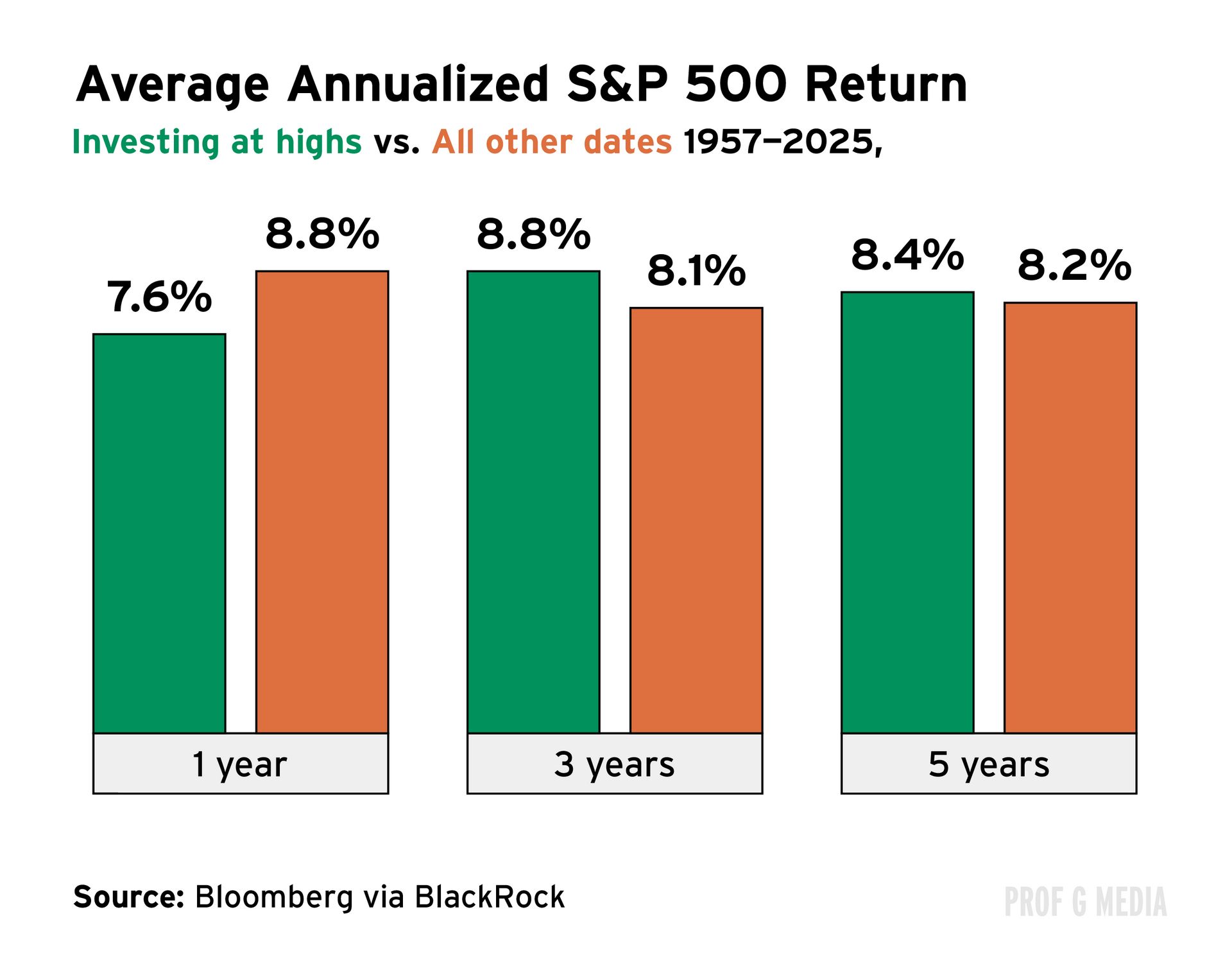 Still, gold isn’t the only option. Historically, investing in the broader market at its peaks has had little impact on long-term returns.